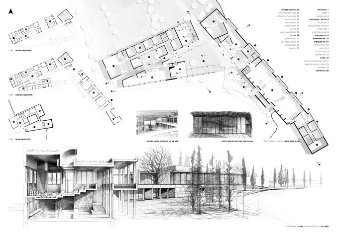 The new site chosen for the Academy of the Hebrew Language in Jerusalem is located in the midst of several other national institution buildings. In a manner befitting their status, each stands as a monolith, separated from the others by roads and parking lots, squares and green spaces. Our proposal attempts to weave together this unraveled landscape and create a living tapestry of human proportions – one that will offer its users a place to walk, linger and contemplate in; that embodies the spirit of Jerusalem and its alleyways, squares and gardens; is not elevated above its neighbors, but communicates in a spoken language, with its façades bordering the street, offering protection and breathing life.